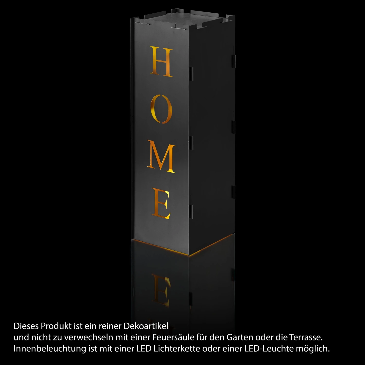 Vielseitiges Deko Highlight! Rund ums Jahr ein wunderbarer Blickfang für den Innen- und Außenbereich! Die Dekosäule im trendigen Stecksystem ziert ein schönes Home Motiv. Bereits tagsüber ist die Dekosäule ein dekorativer Blickfang für Terrasse, Balkon oder Wohnzimmer – am Abend entfaltet sie eine weitere Pracht. Durch eine LED Kerze (separat erhältlich) kann die Dekosäule erleuchtet werden. Das stimmungsvolle Licht strahlt durch das Home Design und verbreitet eine stimmungsvolle Atmosphäre. Im Außenbereich altert die Säule mit zunehmender Witterung und die Säule erstrahlt in einem trendigen Rostlook. Bitte sorgen Sie für eine geeignete Unterlage, da es naturgemäß bei Edelrost zu Abfärbungen kommt.
