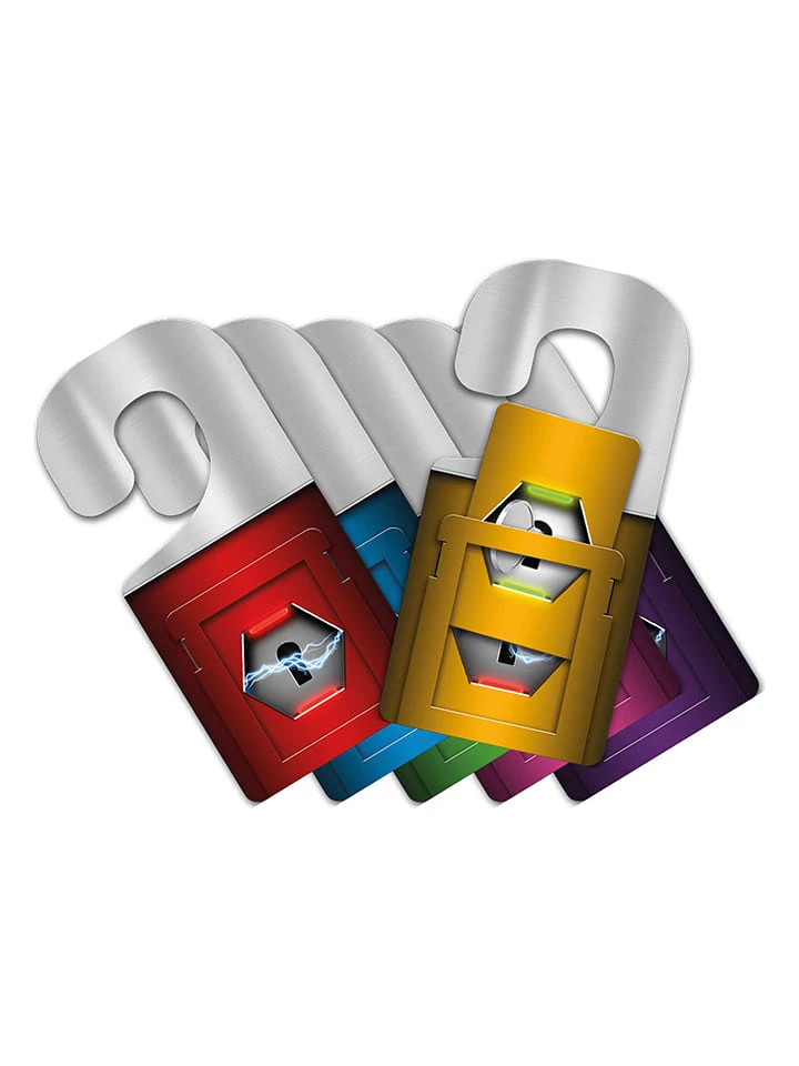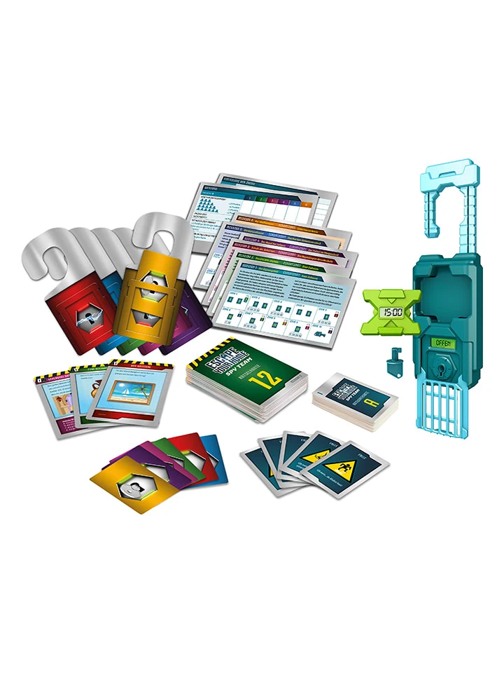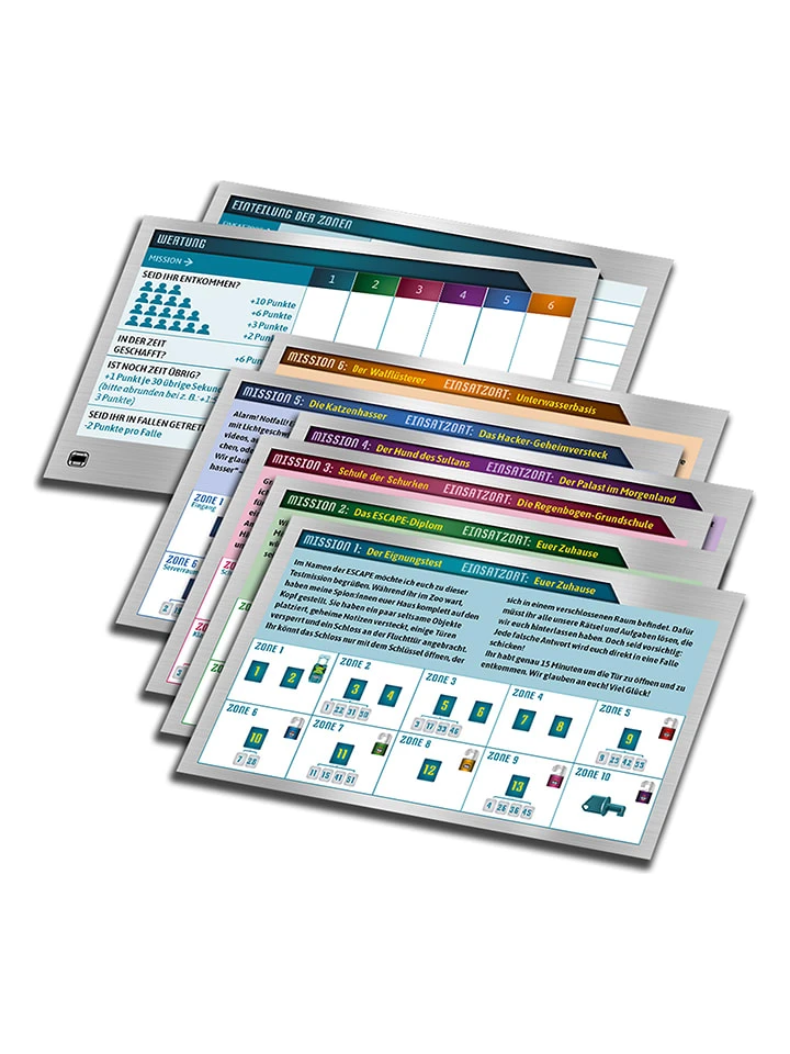 – Inhalt: Türschloss mit Schlüssel, Timer inkl. Batterien, 78 Rätselkarten, 55 Antwortkarten, 6 Türanhänger, 3 Missionenkarten, Wertungskarte zum Nachdrucken, Spielanleitung