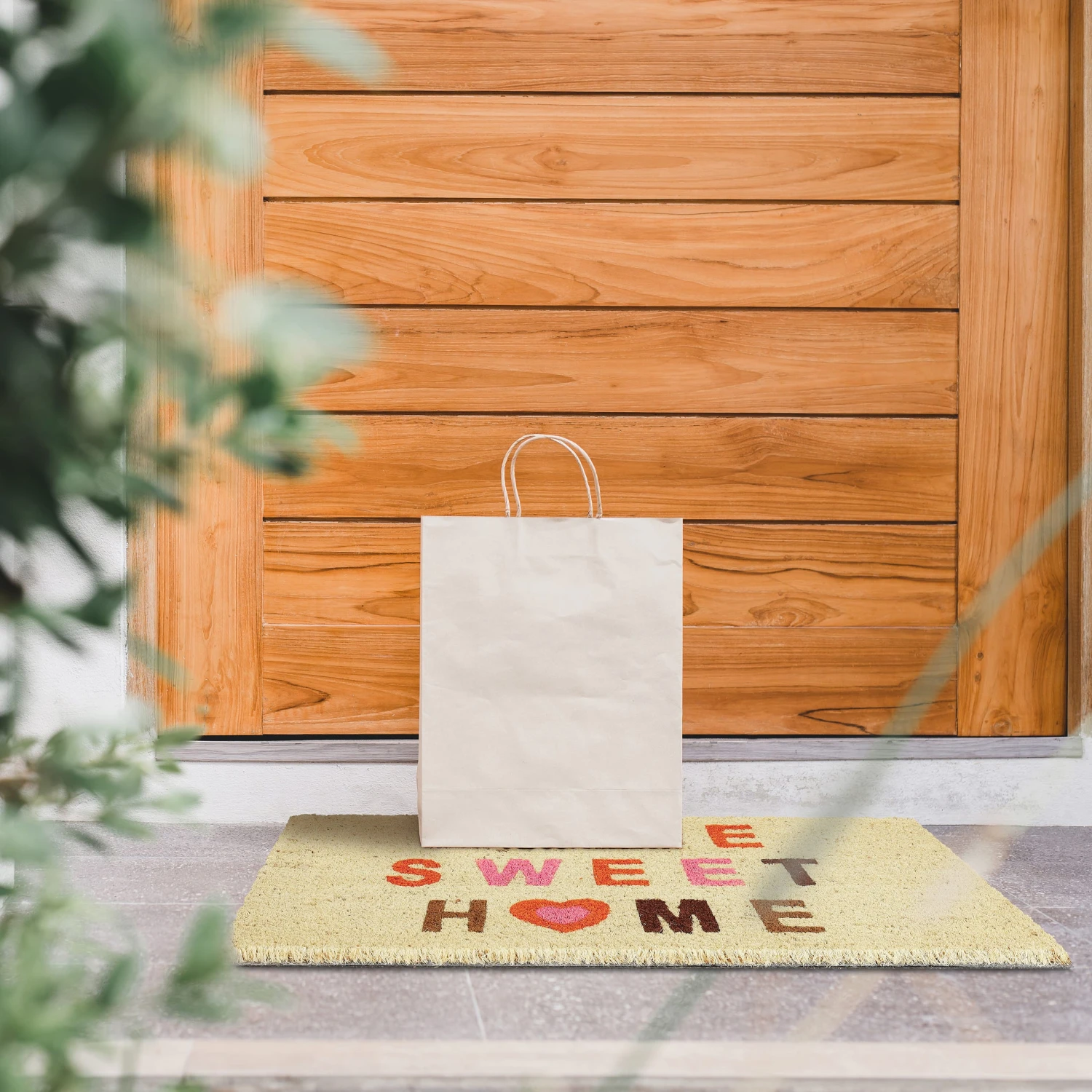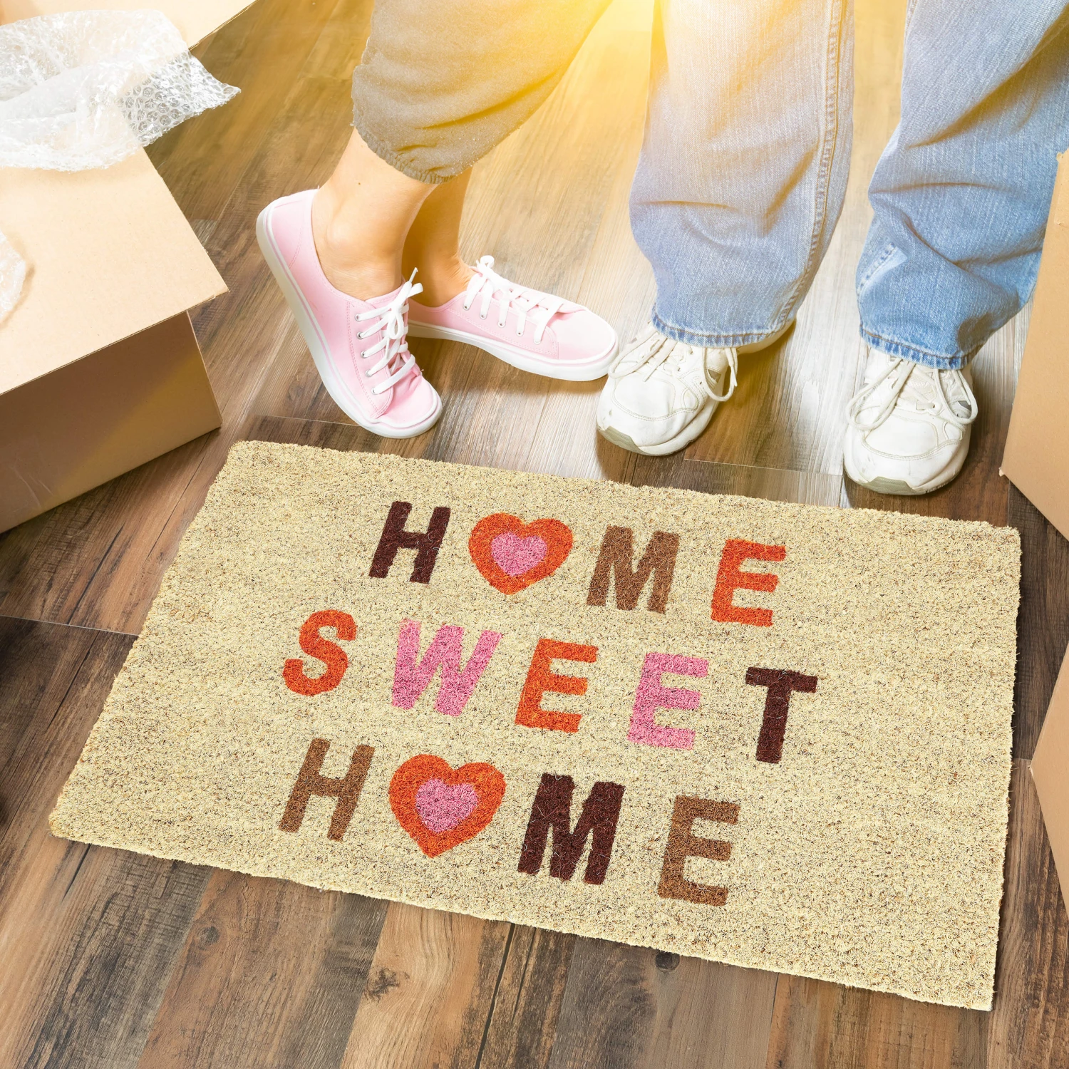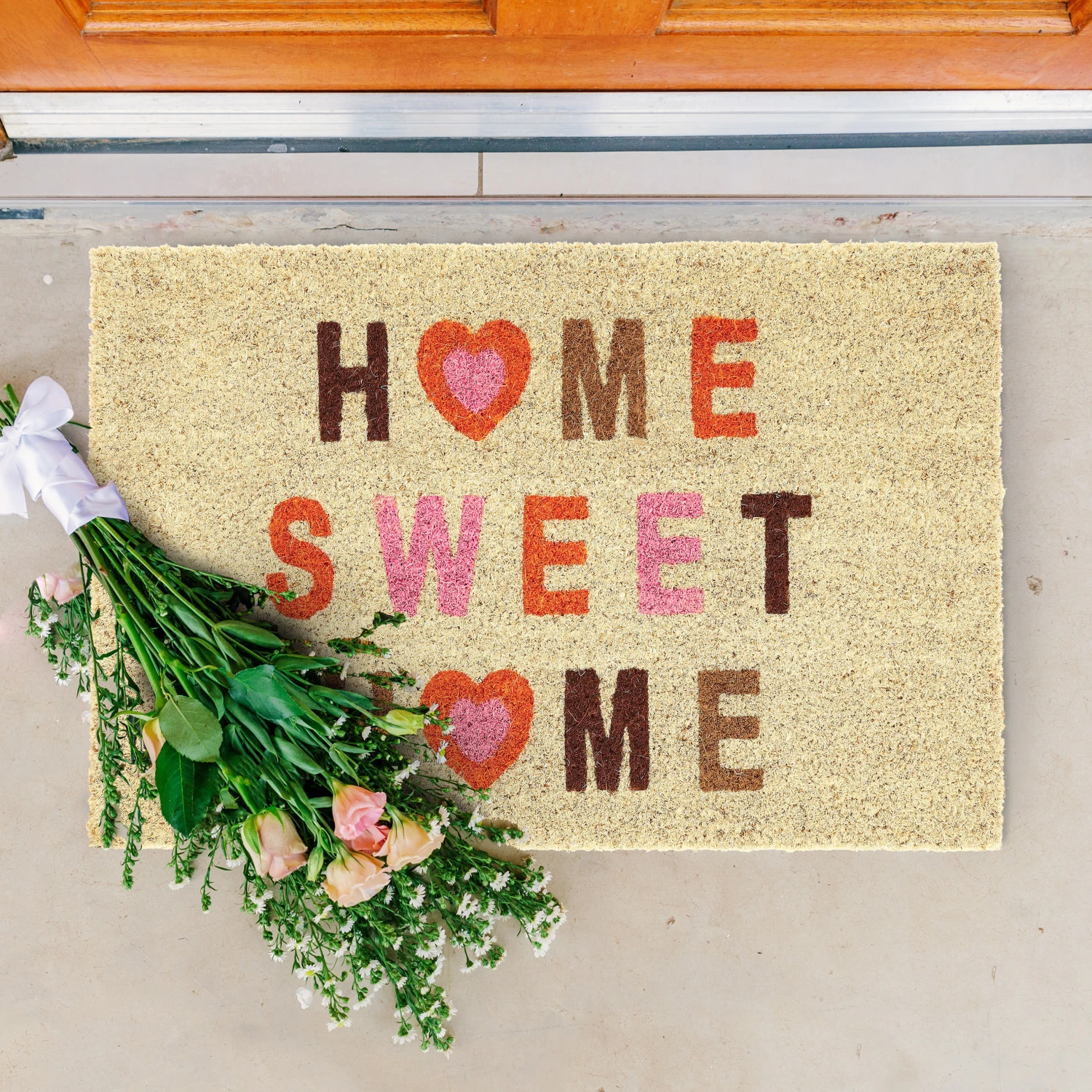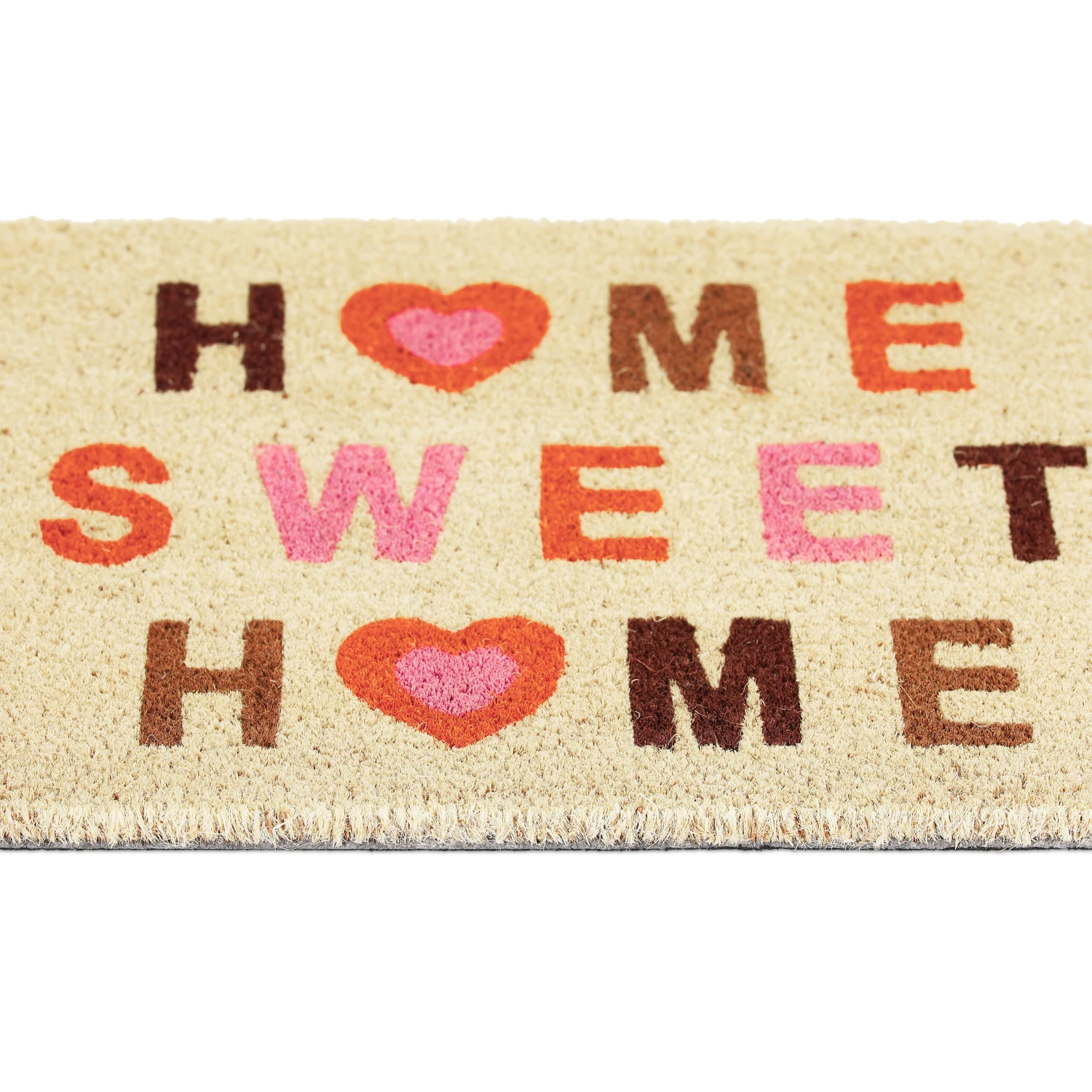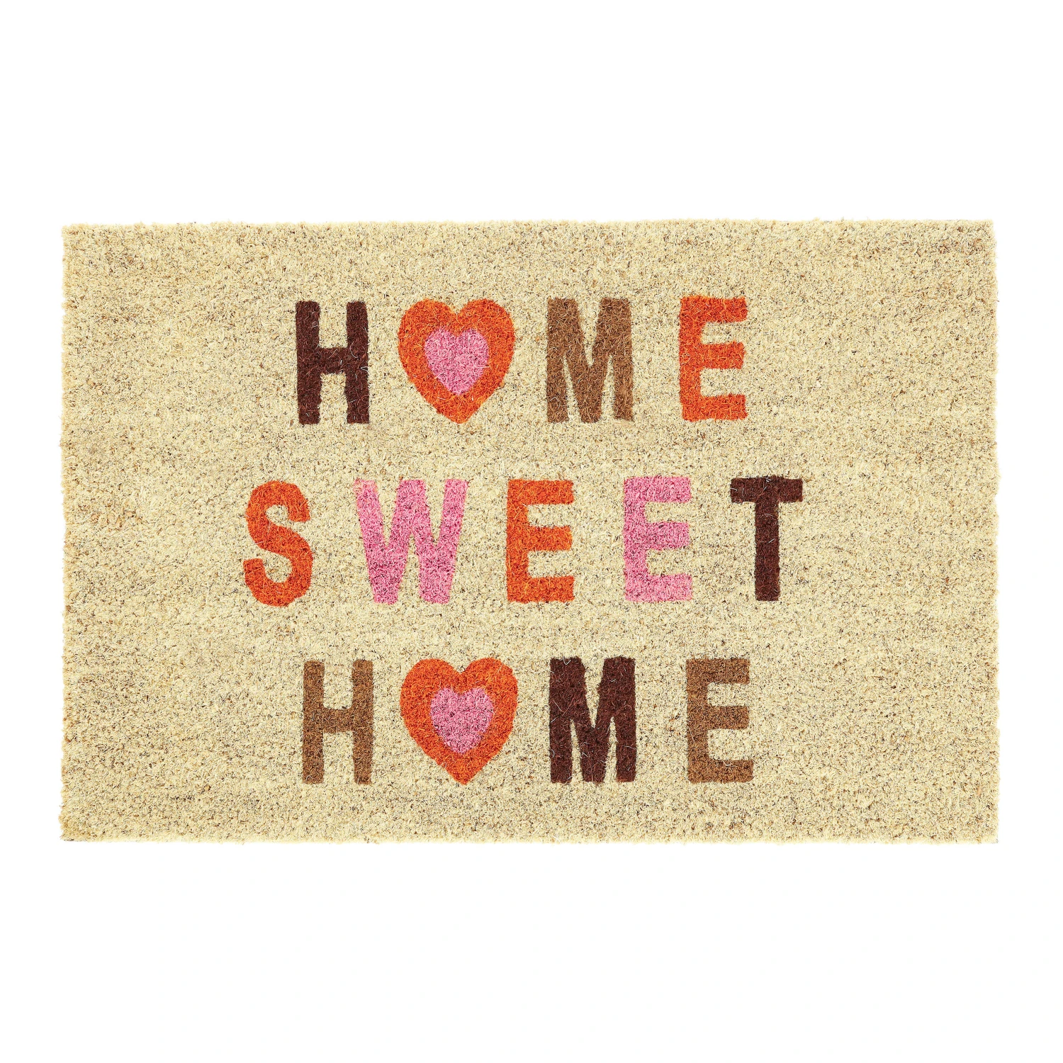 Mit dieser dekorativen Haustürmatte verleihst Du Deinem Eingangsbereich einen einladenden Look und sorgst für saubere Innenräume. Doch der Schmutzabtreter punktet nicht nur mit seinem liebevollen Home Sweet Home-Schriftzug samt süßer Herzen. Durch die natürlichen Kokosfasern ist die Türmatte robust und wetterfest und kann sowohl drinnen als auch draußen genutzt werden. Die Unterseite des Fußabstreifers besteht aus rutschfestem PVC, sodass der Schuhabtreter an seinem angestammten Platz bleibt.