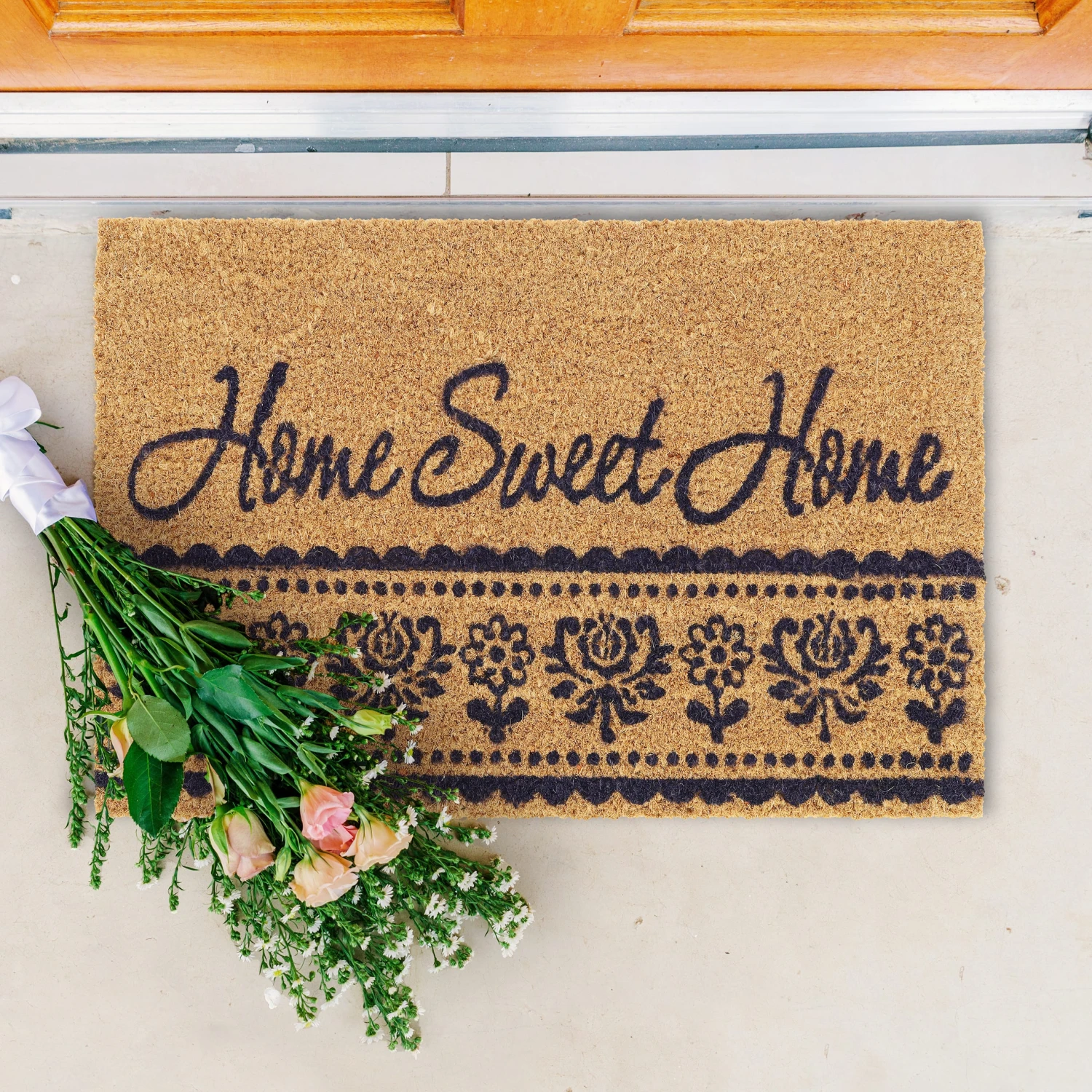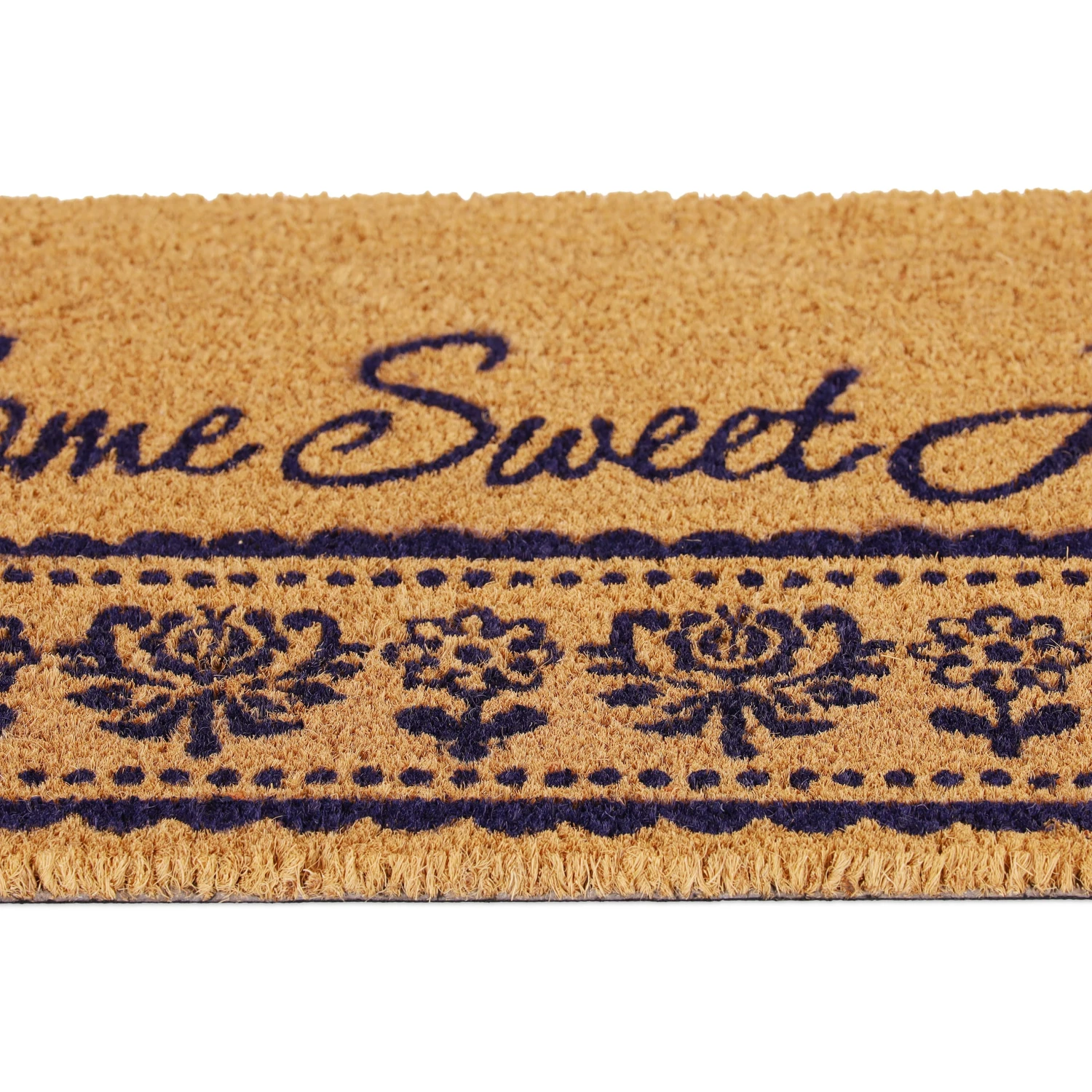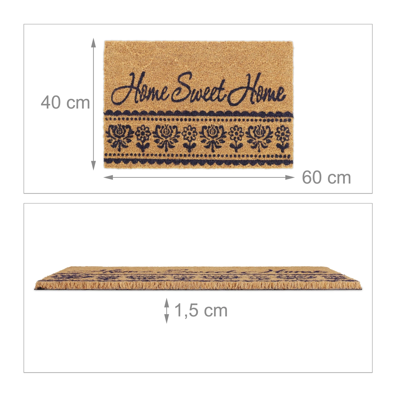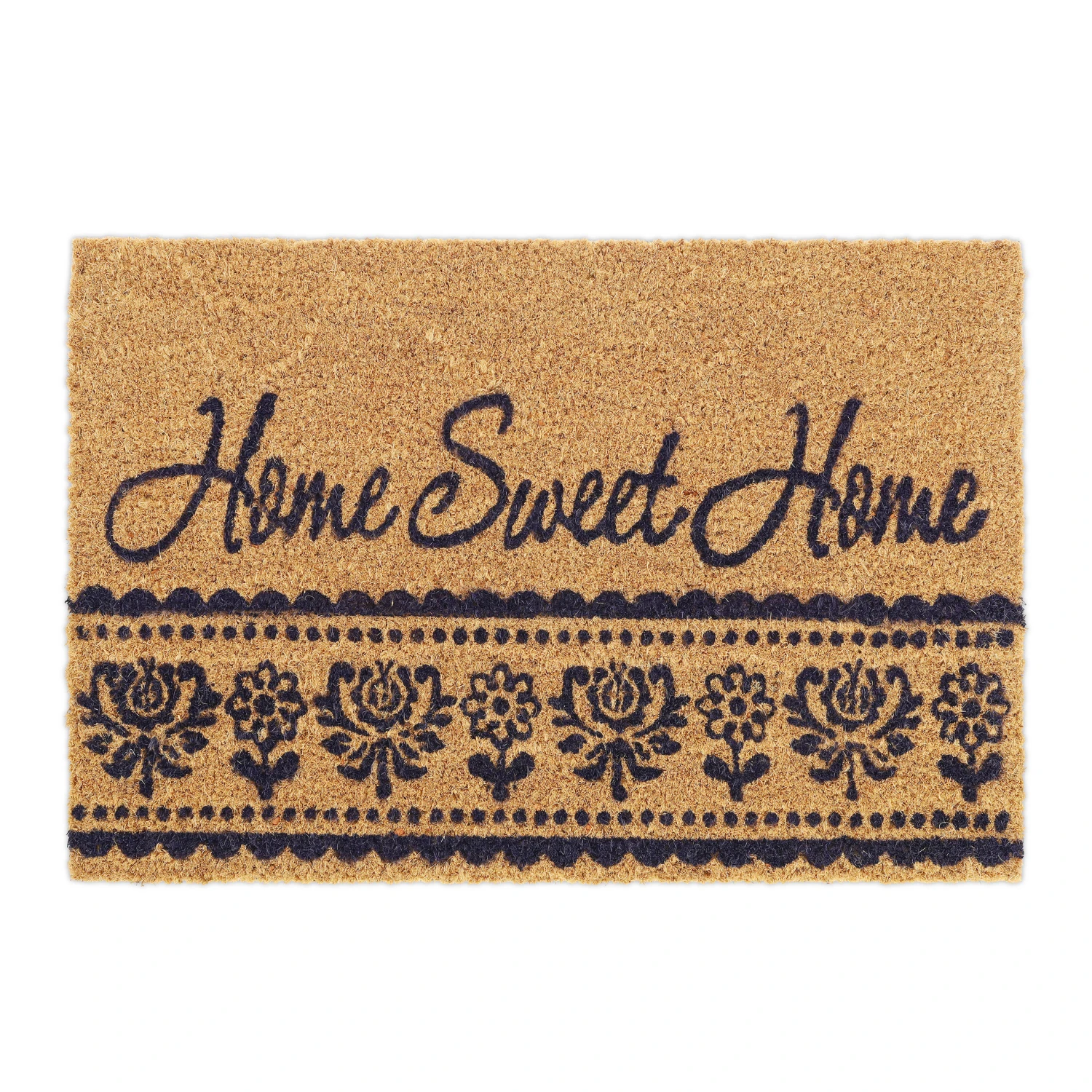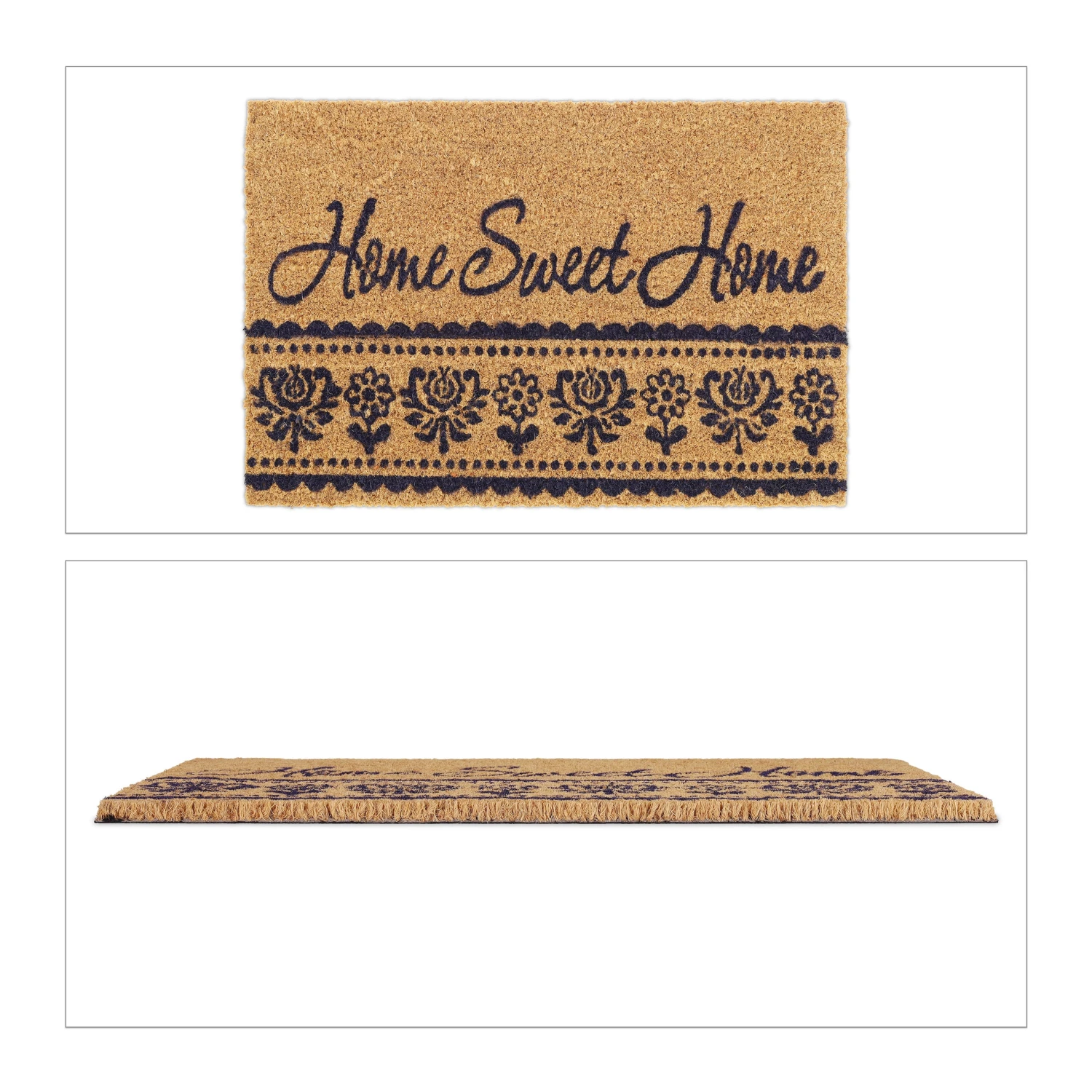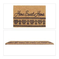 Mit dieser dekorativen Haustürmatte verleihst Du Deinem Eingangsbereich einen einladenden Look und sorgst für saubere Innenräume. Doch der Schmutzabtreter punktet nicht nur mit seinem floralen Design und dem schönen Home Sweet Home-Schriftzug. Durch die natürlichen Kokosfasern ist die Türmatte robust und wetterfest und kann sowohl drinnen als auch draußen genutzt werden. Die Unterseite des Fußabstreifers besteht aus rutschfestem PVC, sodass der Schuhabtreter an seinem angestammten Platz bleibt.