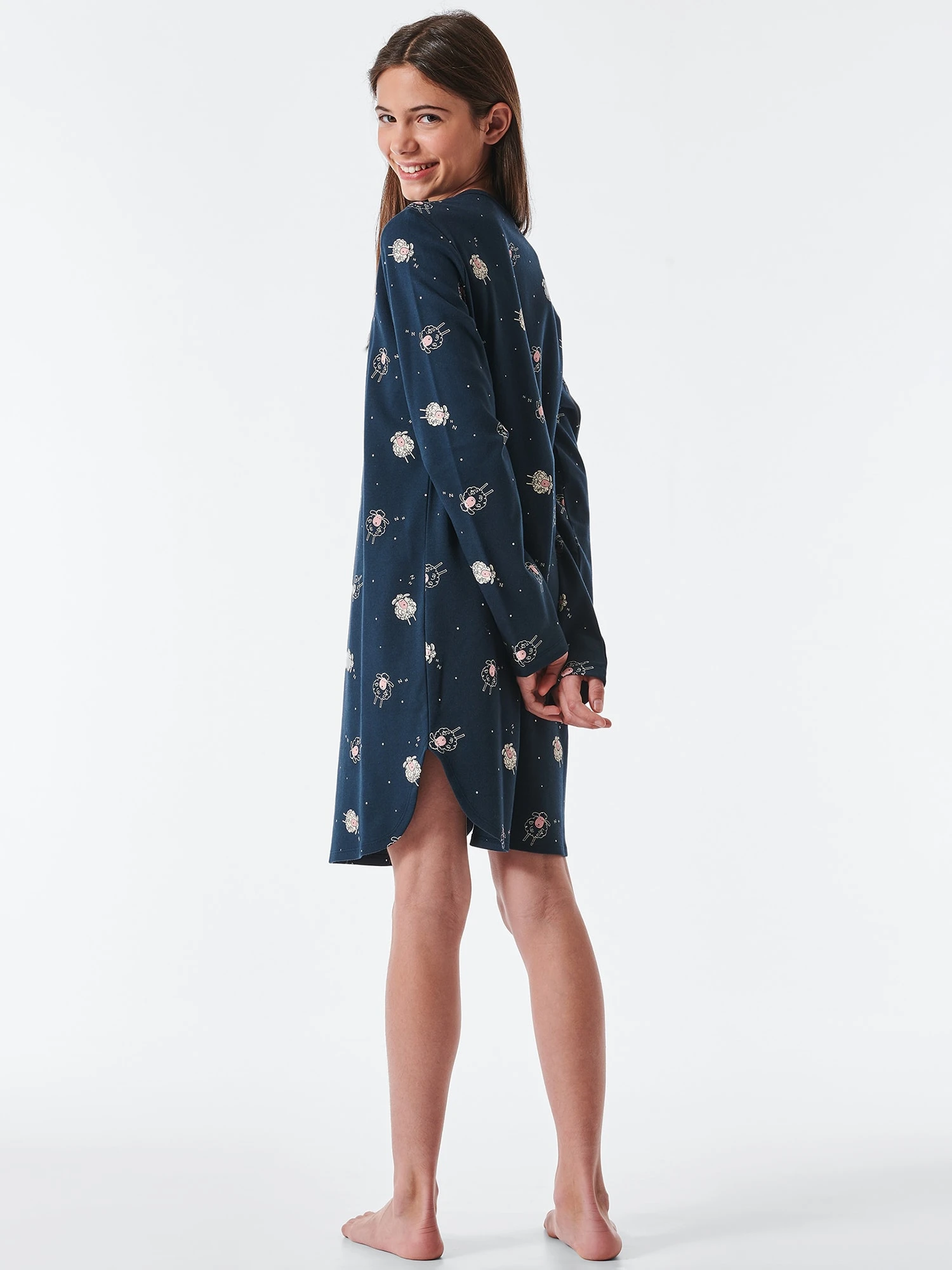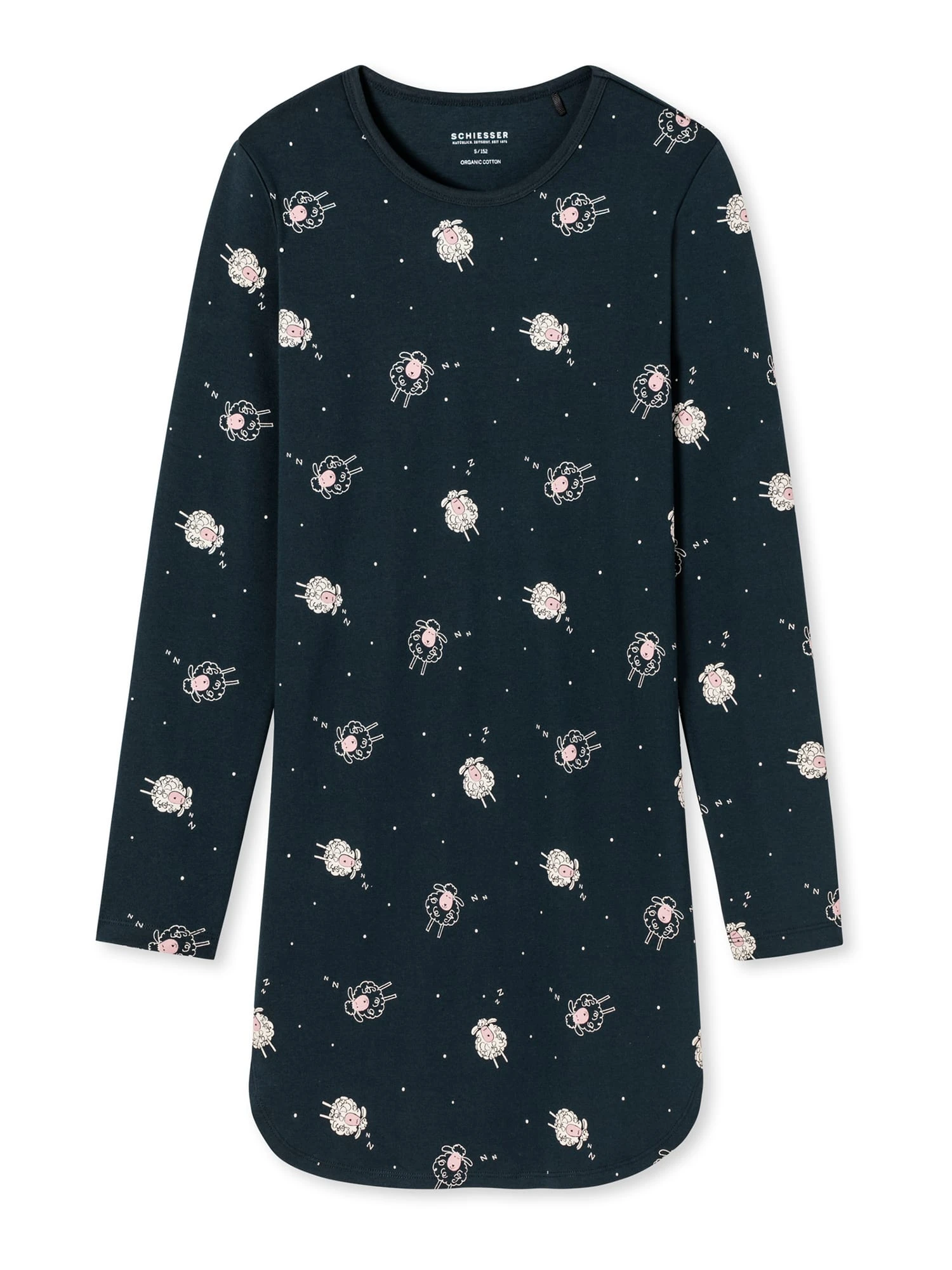 Dieses langärmelige Mädchen-Sleepshirt ist perfekt für alle modischen Tierliebhaberinnen! Im coolen Look überzeugt das anthrazitfarbene Nachthemd auf ganzer Linie. Ein lustiges Muster mit Schafen sowie ein abgerundeter Saum setzen lässige Statements. In wärmendem Interlock mit 100 % Organic Cotton und in bester SCHIESSER-Qualität lässt es sich dazu herrlich entspannen und träumen!