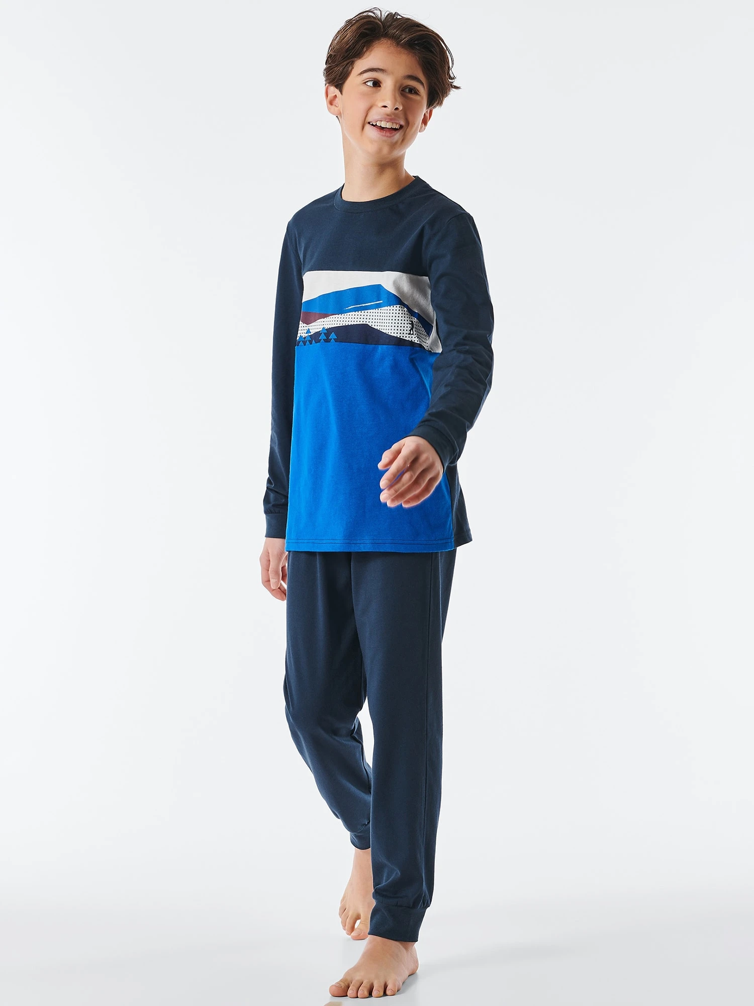 Dieser lange Jungenschlafanzug ist genau das Richtige für sportbegeisterte Boys! Das Langarmshirt sieht im coolen Colour-Blocking aus Anthrazit, Weiß und Royalblau super modisch aus. Auf der Brust sorgt ein farbenfrohes Skifahrer-Motiv mit Bergen und Tannenbäumen für gute Laune. Die anthrazitfarbene Schlafhose ist dank 100 % Organic Cotton bequem und lädt mit tollen Bündchen zum Entspannen ein – natürlich in bester SCHIESSER-Qualität!