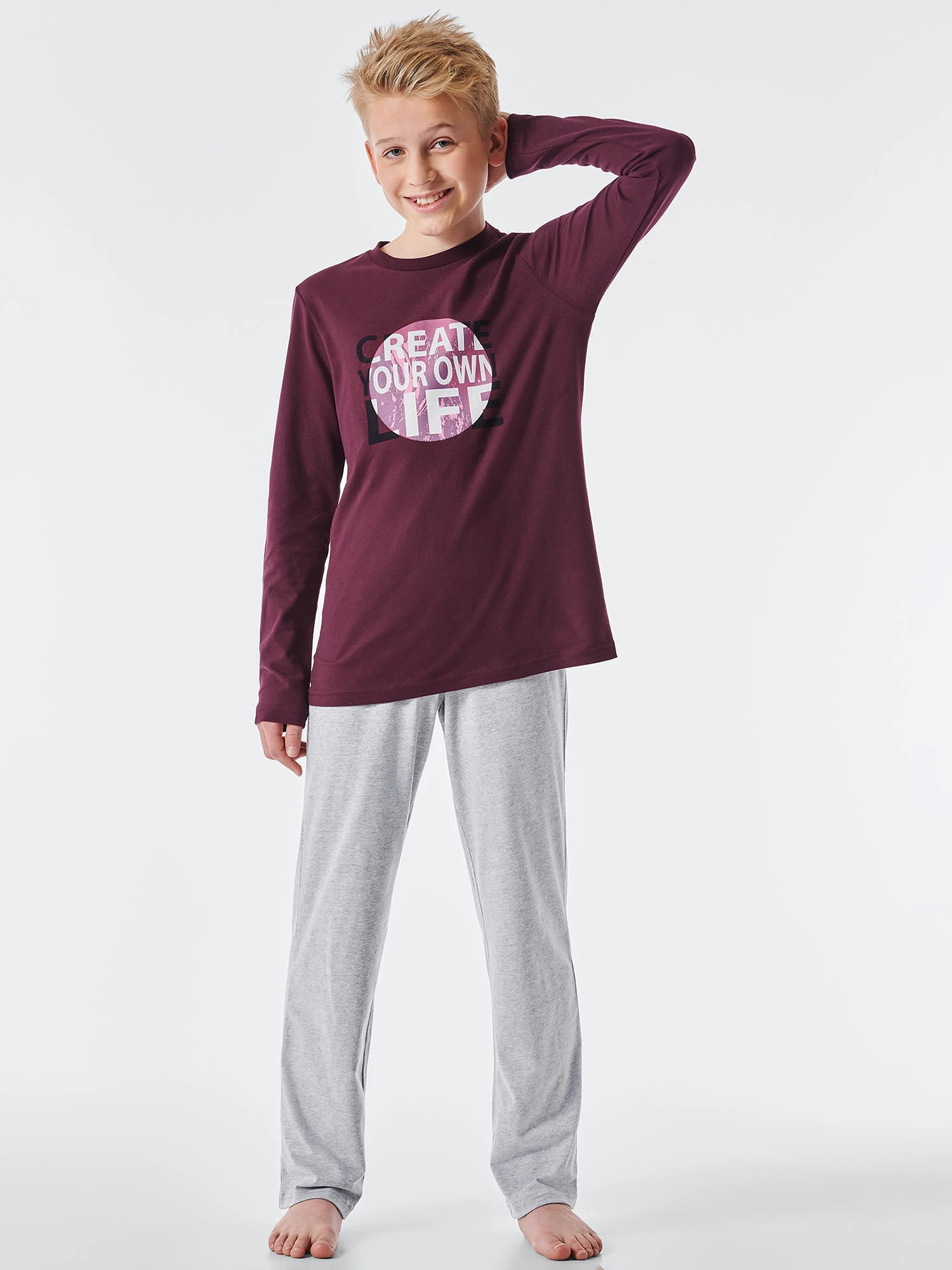 Dieser lange Schlafanzug ist perfekt für sportbegeisterte Jungen. Das burgunderfarbene Langarmshirt ist mit dem grafischen Berg-Motiv und dem schwarz-weißen “CREATE YOUR OWN LIFE”-Schriftzug ein echter Blickfang. Auch die grau-melierte Schlafhose sieht richtig cool aus und sitzt dank komfortablen Bund perfekt am Körper. Gemeinsam mit dem soften Single Jersey aus 100 % Organic Cotton lässt es sich cool und lässig entspannen – natürlich in bester SCHIESSER-Qualität!