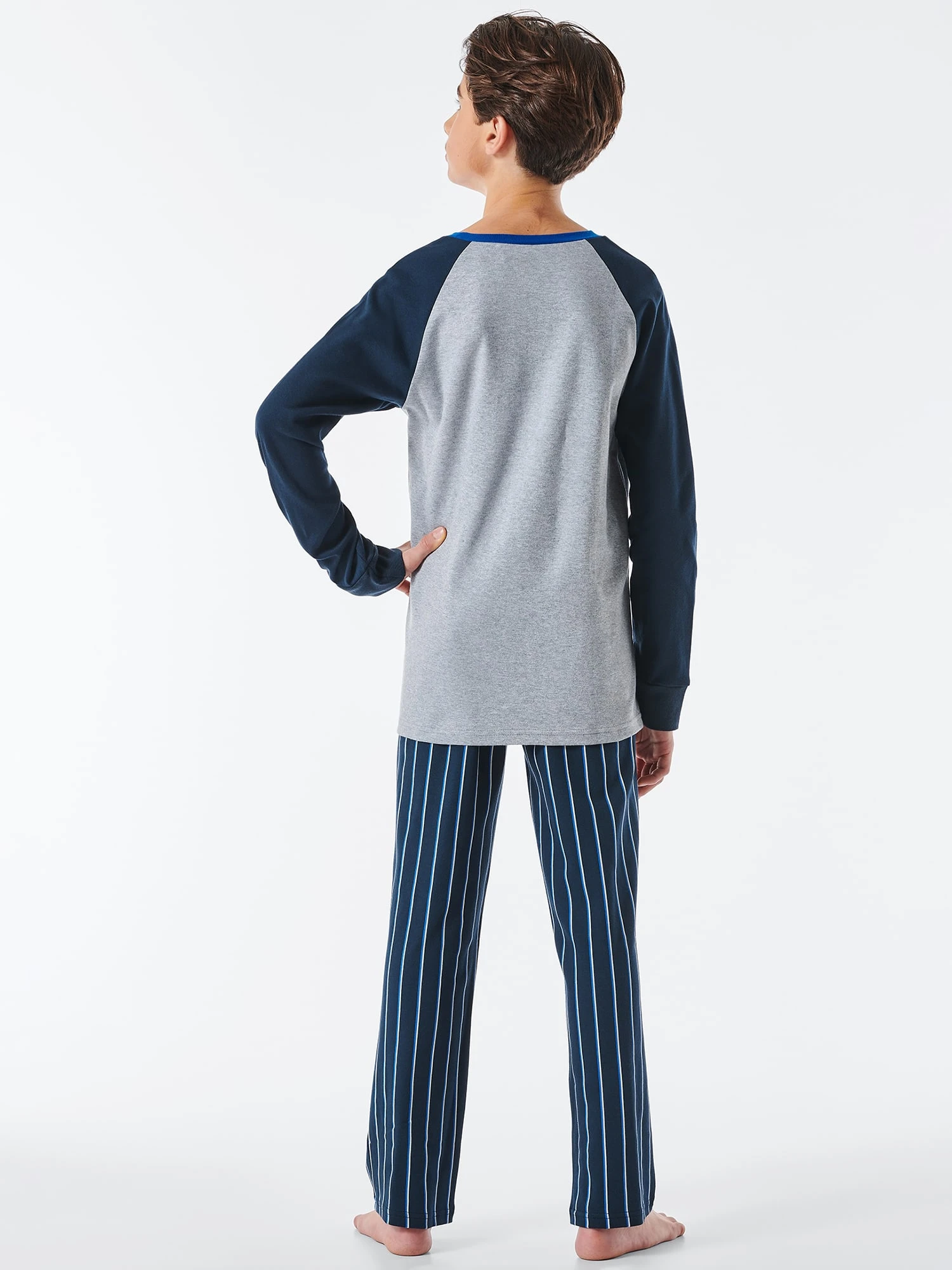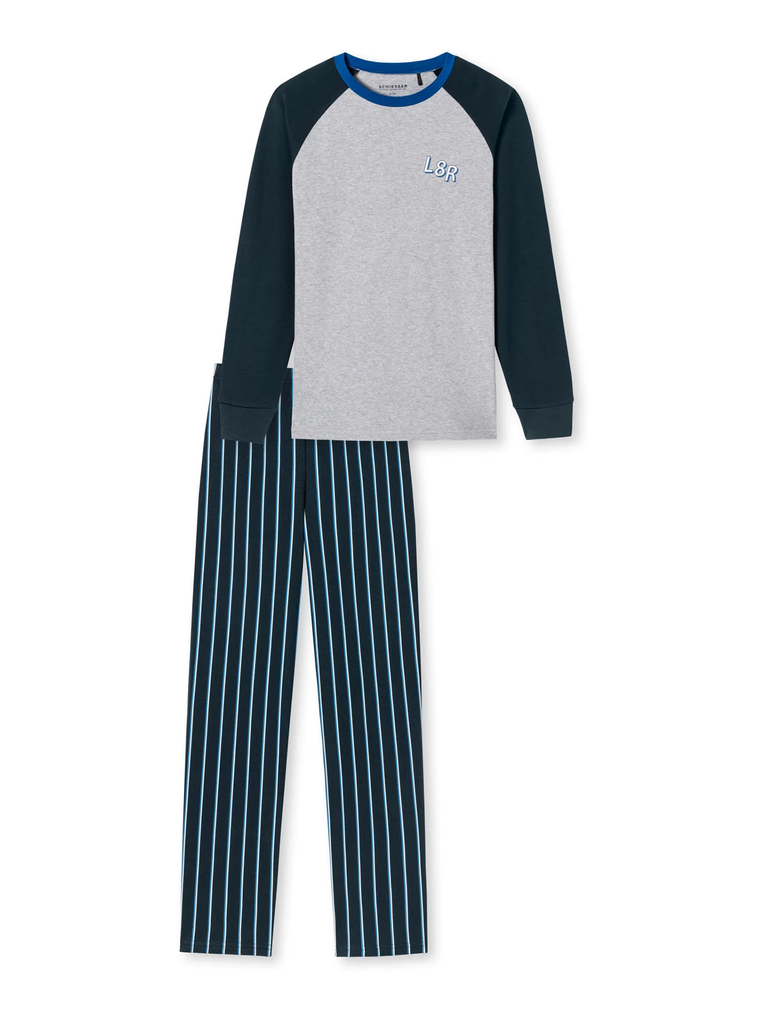 Dieser lange Jungenschlafanzug ist ein Muss für coole Teens! Das weiße Langarmshirt ist mit seinem groben College-Look und dunkelblauen Ärmeln ein lässiger Hingucker. Zwei echte Statements sind zudem der burgunderfarbene Rundhalsausschnitt sowie der mehrfarbige “GR8”-Schriftzug auf der Vorderseite. Die karierte Schlafhose in Blau, Rot und Weiß bietet jede Menge Bewegungsfreiheit und dank warmen Interlock aus 100 % Organic Cotton sind entspannte Träume in bester SCHIESSER-Qualität garantiert.