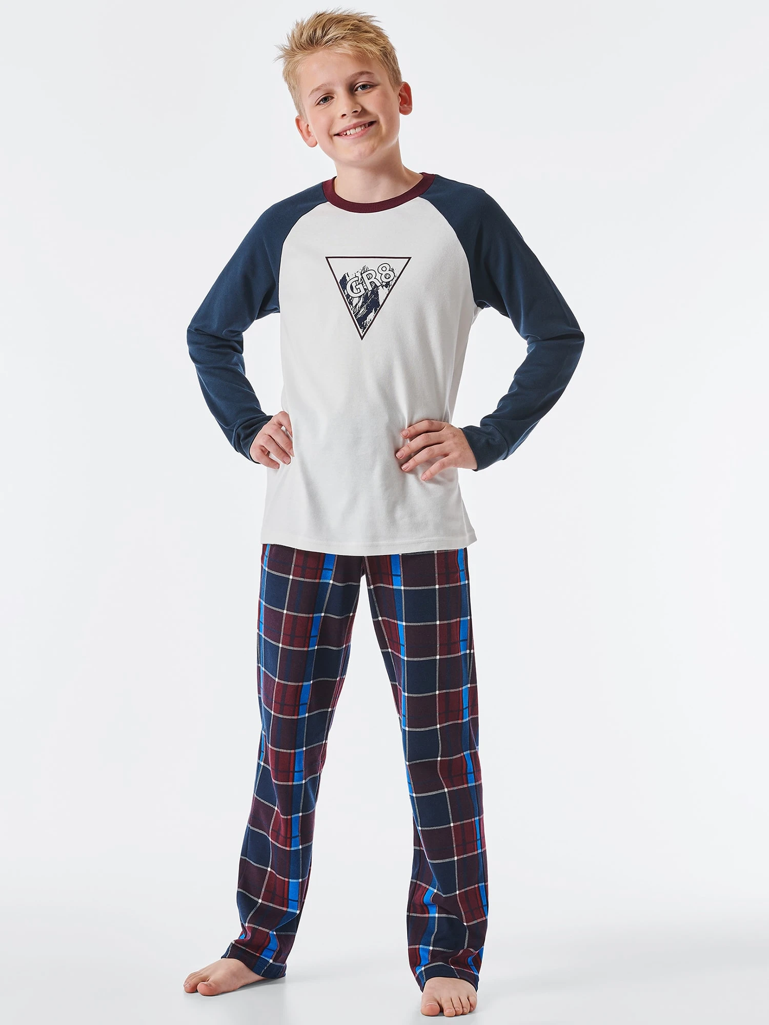 Dieser lange Jungenschlafanzug ist ein Muss für coole Teens! Das weiße Langarmshirt ist mit seinem groben College-Look und dunkelblauen Ärmeln ein lässiger Hingucker. Zwei echte Statements sind zudem der burgunderfarbene Rundhalsausschnitt sowie der mehrfarbige “GR8”-Schriftzug auf der Vorderseite. Die karierte Schlafhose in Blau, Rot und Weiß bietet jede Menge Bewegungsfreiheit und dank warmen Interlock aus 100 % Organic Cotton sind entspannte Träume in bester SCHIESSER-Qualität garantiert.