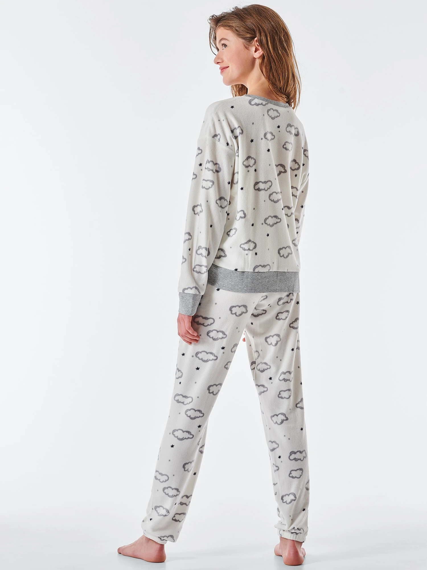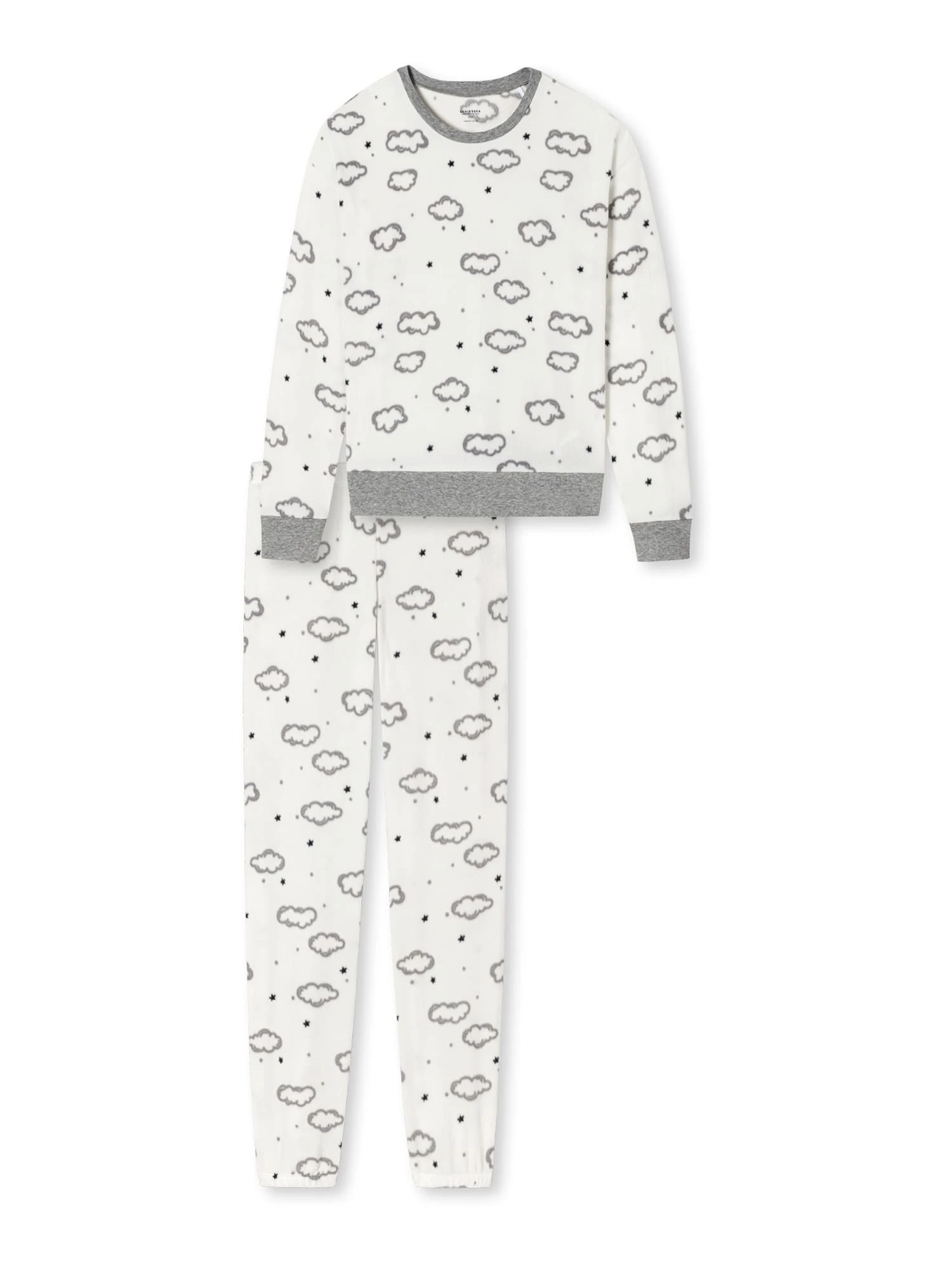 Ein weißes Design macht diesen langen Mädchen-Schlafanzug zum absoluten Liebling! Besonders lässig wirkt der Look mit dem grau-melierten Rundhalsausschnitt und der überschnittenen Schulter. Ein cooler Eyecatcher ist das graue Wolken-Muster mit den kleinen Sternen dazu. Für den zusätzlichen Kuschelfaktor sorgen die Schlafhose, grau-melierte Bündchen und weicher Fleece – natürlich in bester SCHIESSER-Qualität!
